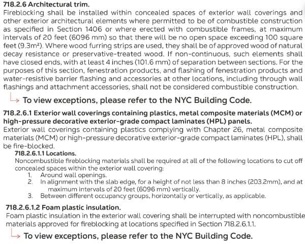 The products have undergone extensive fire testing, including NFPA285 at Intertek and Underwriter Laboratories (UL), and are a NYC OTCR/DOB approved material in accordance with the 2022 NYC Building Code Section 718.2.1 (item #8) when required in concealed spaces of exterior wall coverings as specified in accordance with BC 718.2.6.1.